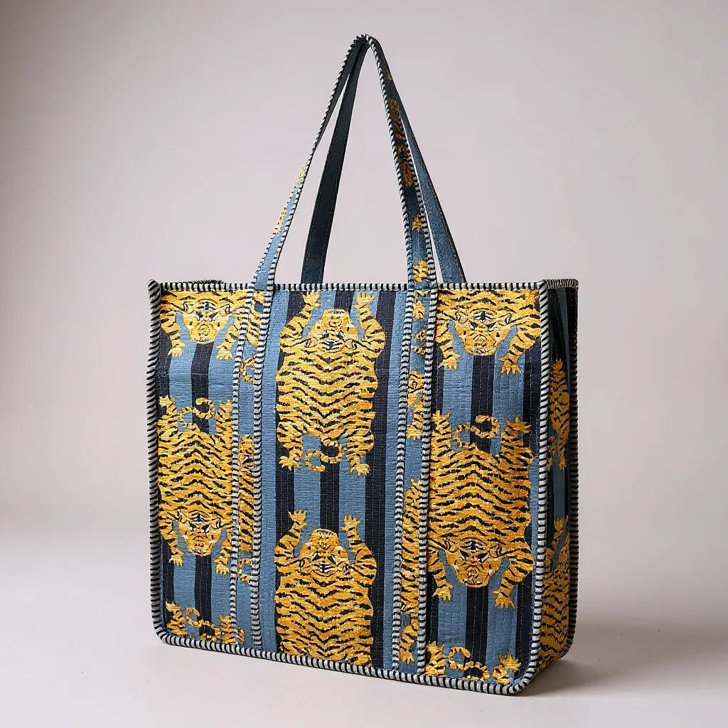 - Each bag is carefully crafted - Perfect for everyday use - Plenty of space to fit everything - Bag also contains an inside square pocket. - Size: 19 in X 17 in X 5 in - Fabric type: 100% Cotton Care Instructions Washing: To keep your tote bag looking fresh, hand washing is recommended. If using a machine, place the bag in a laundry mesh bag and select a gentle cycle. Always use cold water and a mild detergent to preserve the fabric and prevent fading. Drying & Storage: Lay the bag flat to air dry, avoiding direct sunlight to maintain its vibrant colors. Store in a cool, dry place to retain its shape and material quality. Following these care tips will help extend the life of your cotton quilted tote bag.