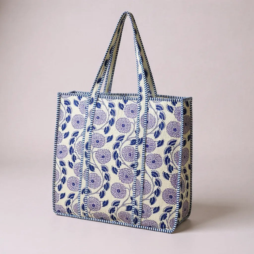 - Each bag is carefully crafted - Perfect for everyday use - Plenty of space to fit everything - Bag also contains an inside square pocket. - Size: 19 in X 17 in X 5 in - Fabric type: 100% Cotton Care Instructions Washing: To keep your tote bag looking fresh, hand washing is recommended. If using a machine, place the bag in a laundry mesh bag and select a gentle cycle. Always use cold water and a mild detergent to preserve the fabric and prevent fading. Drying & Storage: Lay the bag flat to air dry, avoiding direct sunlight to maintain its vibrant colors. Store in a cool, dry place to retain its shape and material quality. Following these care tips will help extend the life of your cotton quilted tote bag.