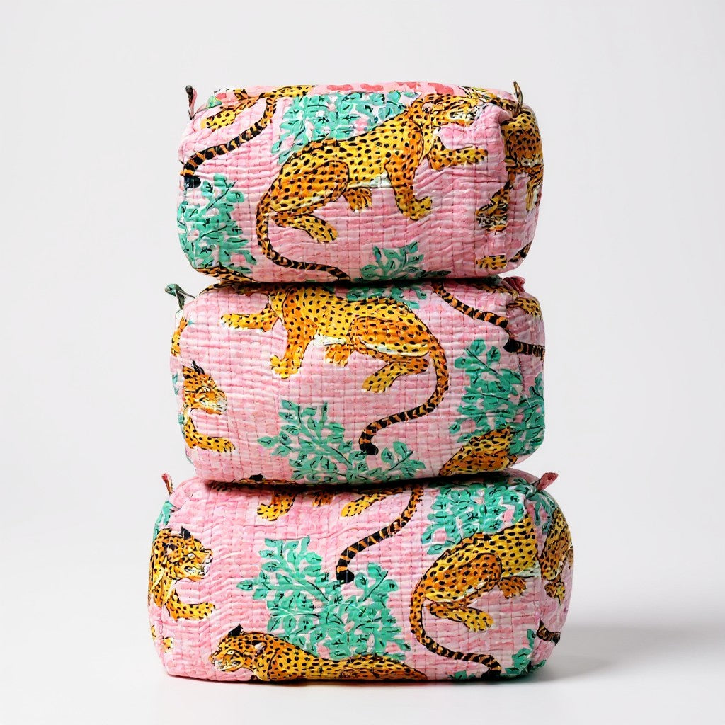 This set of three 100% cotton printed toiletry bags provides a unique and flexible option for all your travel necessities. Featuring a quilted design, these bags combine durability with style, making them perfect for keeping your essentials neatly organized on the go.
